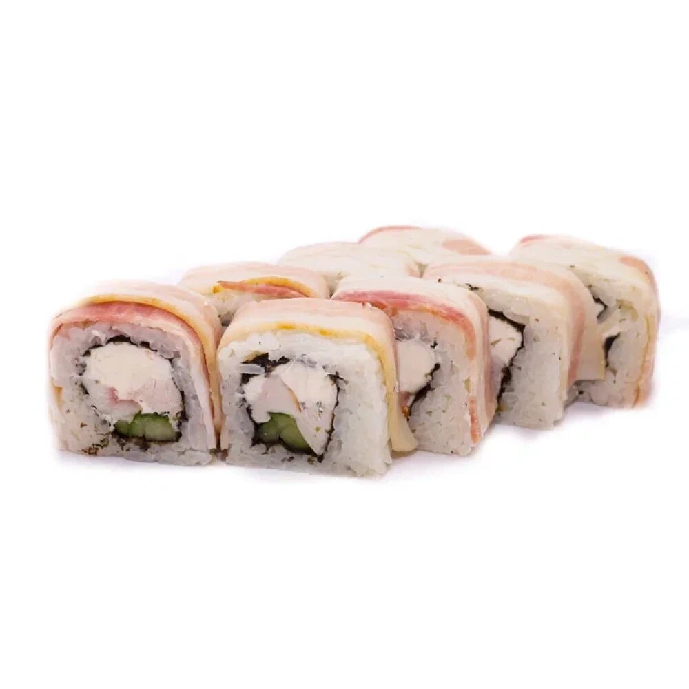 Состав: Состав: рис, нори, сыр, огурец, курица, бекон