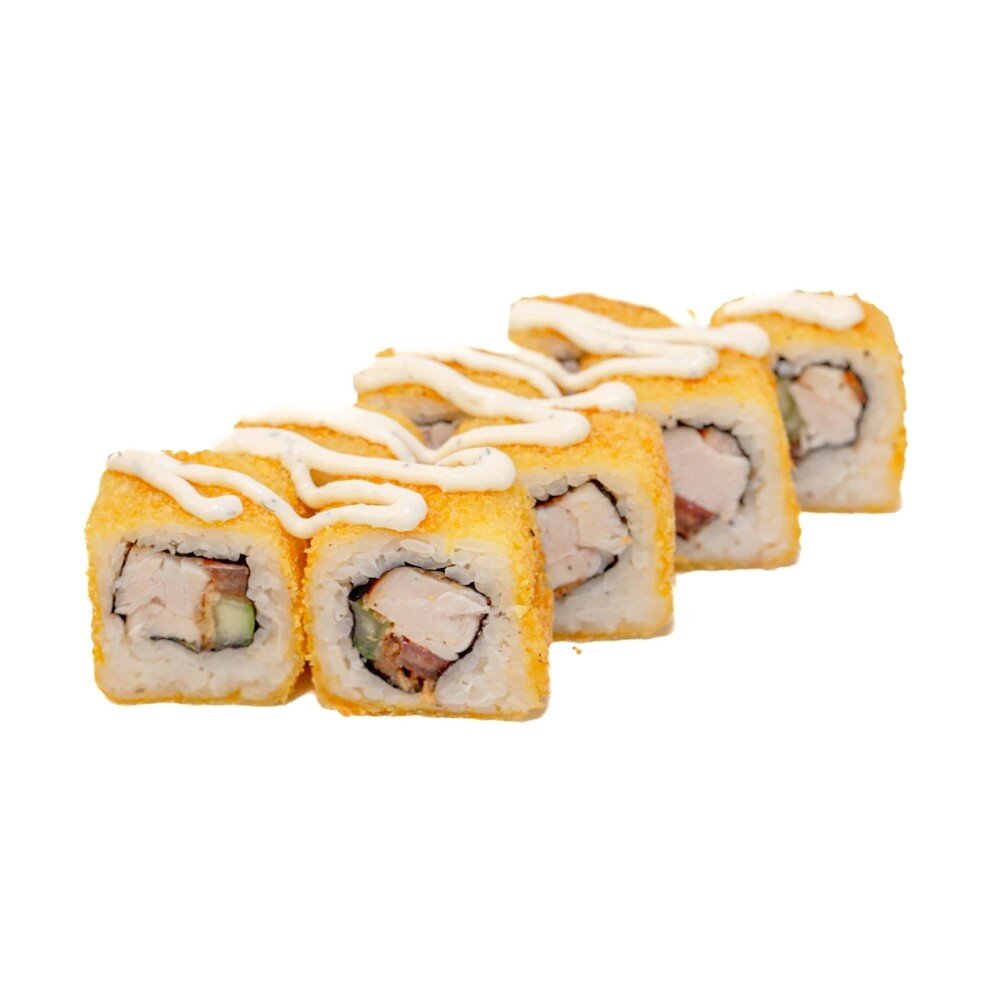 Состав: нори, рис, курица, лук фри, огурец, томат, белый соус.