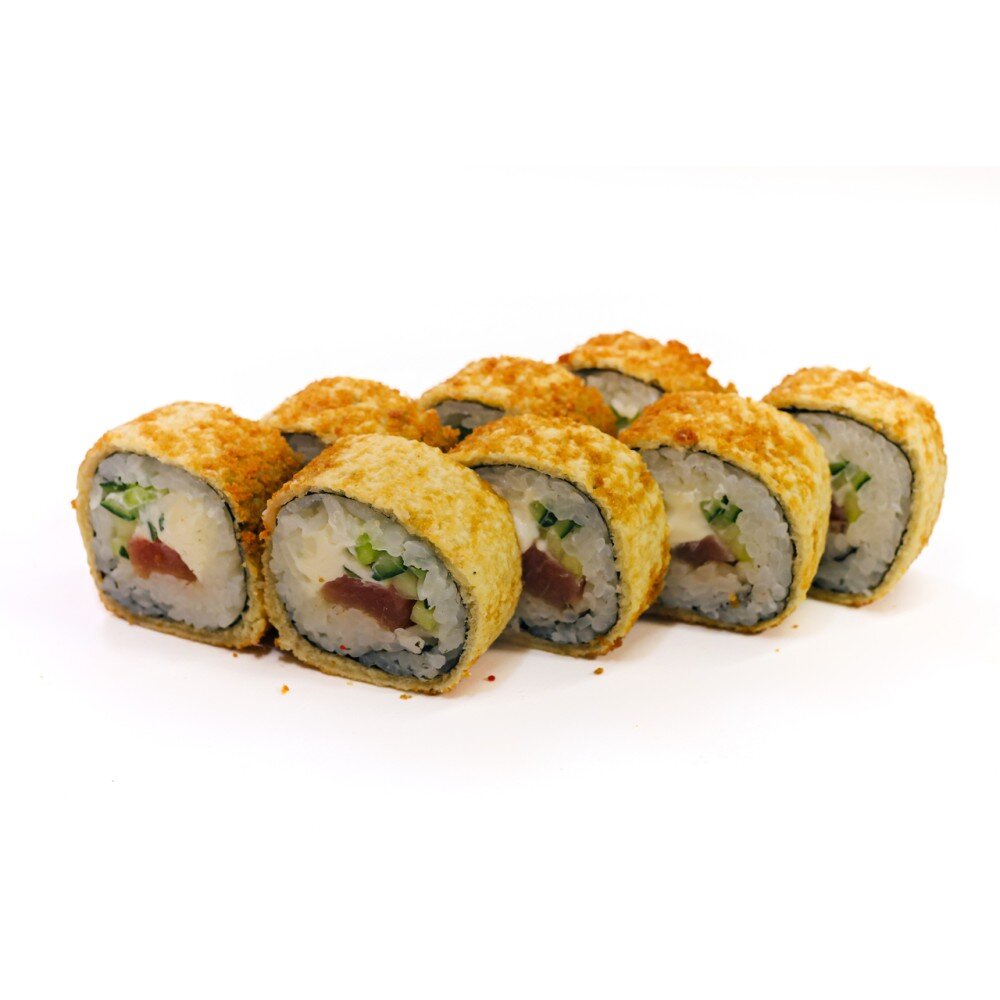 Состав:рис,нори,сыр,тунец,огурец,кляр,сухари