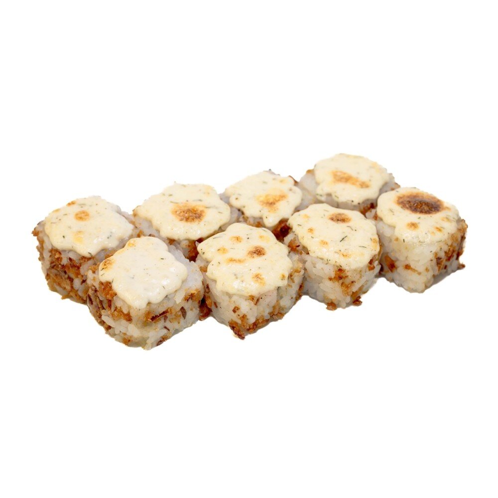 Состав: нори, рис, сыр, мидии, лук зеленый, лук фри, белый соус.