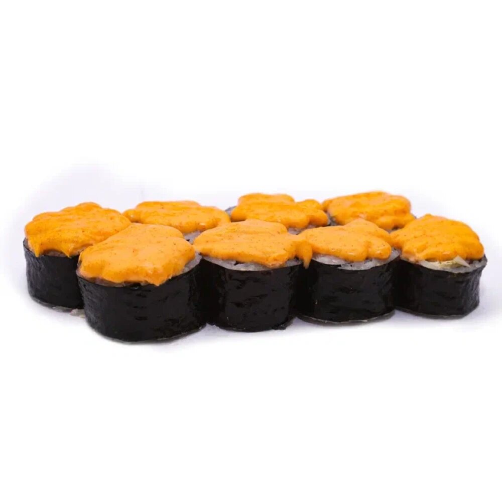 Состав: рис, нори, жаренный лосось, пекинка, соус спайс