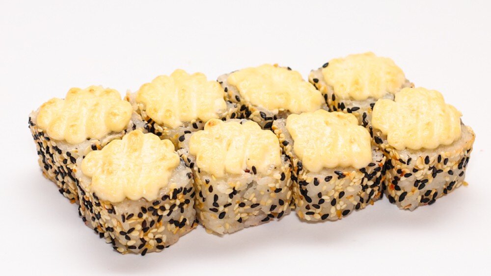 Состав: рис, нори , сыр, краб, томат, кунжут, чесночный соус.