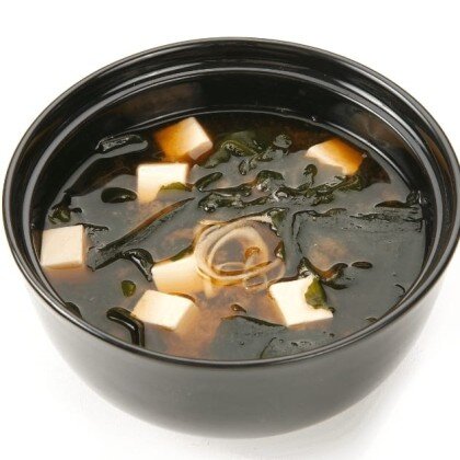 Лосось, хондаши, грибы шитаки, сыр тофу, водоросли вакаме, мисо паста, лук зеленый, кунжут.