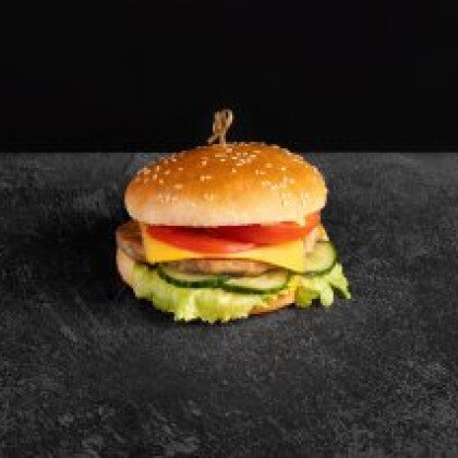 Состав: Нежная булочка, куриная котлета, соус биг тейсти, огурцы соленые, сыр, лук красный.
