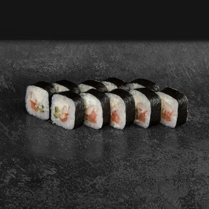 Состав: рис, нори, сыр творожный, угорь, лосось, имбирь, кунжут, огурец, соус спайси. В комплекте: имбирь-1 шт, васаби-1 шт, соевый соус-1 шт.