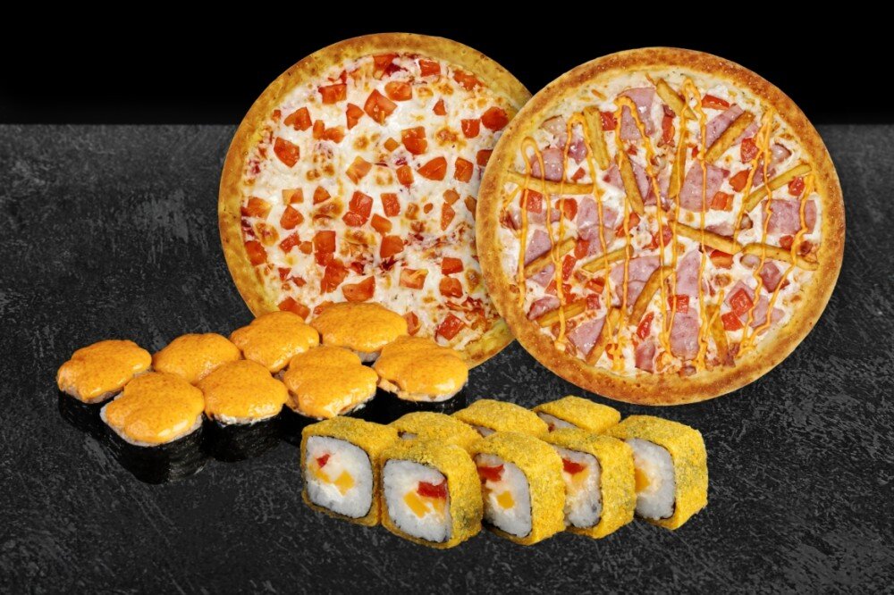Состав: Пицца Домашняя, Пицца Маргарита, Темпурный 4 сыра, Запеченный Чили-Вили. В комплекте: имбирь - 2 шт., васаби - 2 шт., соевый соус - 2 шт.
