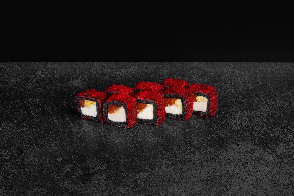 Состав: Рис черный, нори, сыр творожный, томаго, лосось, икра масаго, спайси соус. В комплекте: имбирь-1 шт, васаби-1шт, соевый соус-1 шт.
