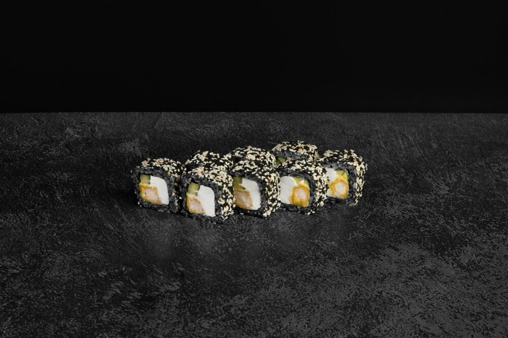 Состав: Рис черный, нори, креветки в кляре, сыр творожный, огурец, кунжут, соус спайси. В комплекте: имбирь-1 шт, васаби-1шт, соевый соус-1 шт.