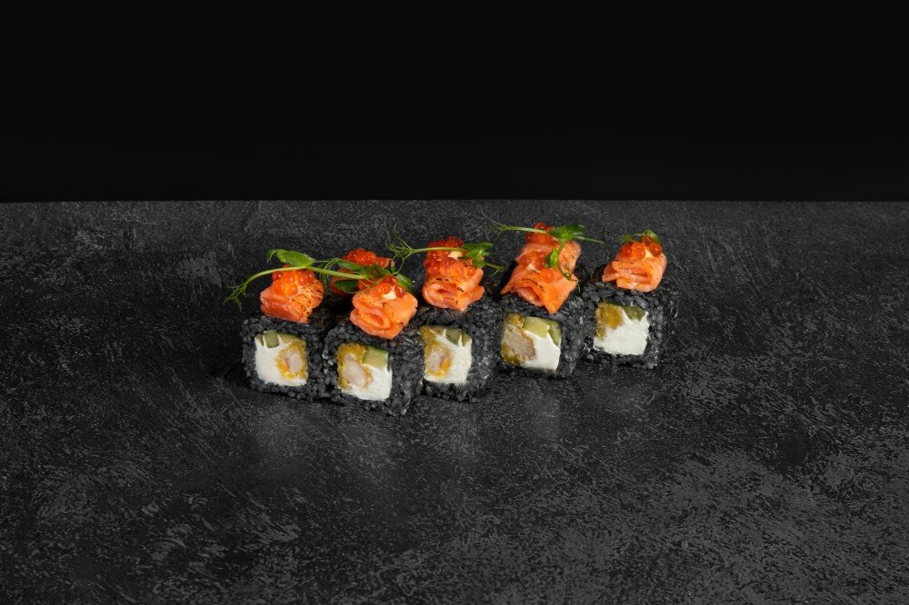 Состав: Рис черный, нори, сыр творожный, огурец, креветки в кляре, лосось, икра масаго, микрозелень, спайси соус. В комплекте: имбирь-1 шт, васаби-1шт, соевый соус-1 шт.