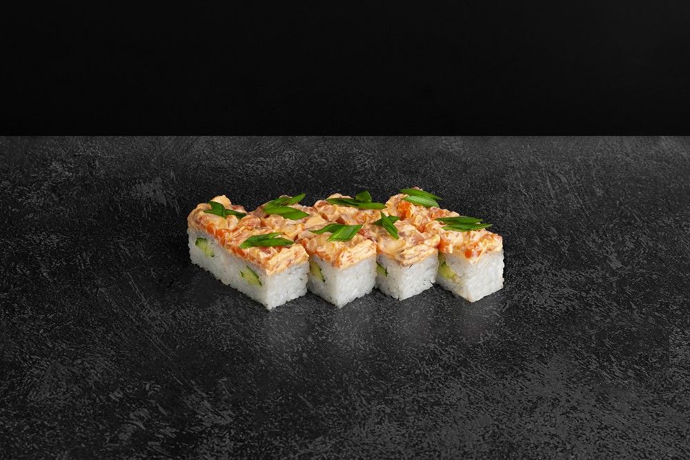 Состав: рис, нори, огурец, лосось, соус спайси, лук зеленый. В комплекте: имбирь-1 шт, васаби-1 шт, соевый соус-1 шт.