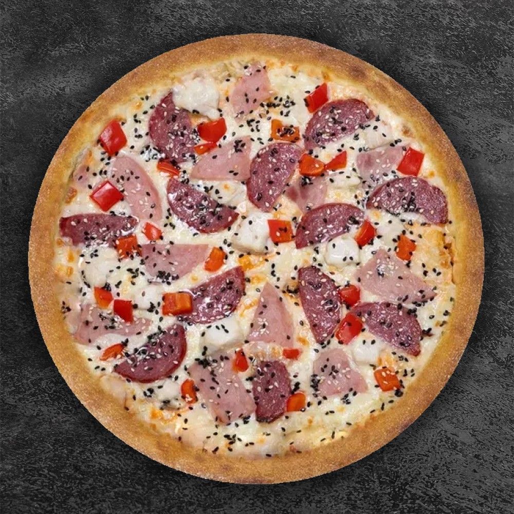 Состав: Тесто, бургерный соус, сыр моцарелла, ветчина, курица, перец болгарский, сервелат, кунжутный микс.