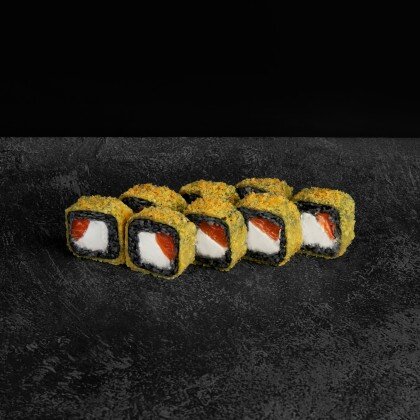 Состав: рис, нори, сыр творожный, лосось жареный в соусе терияки, кунжут, соус унаги. В комплекте: имбирь-1 шт, васаби-1шт, соевый соус-1 шт.