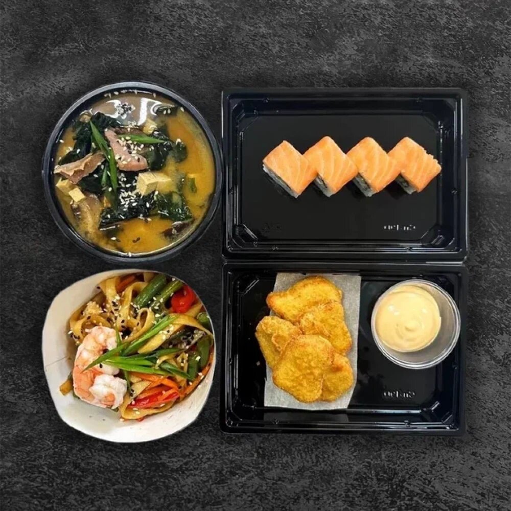 Состав: Миссо суп с тунцом, филадельфия 1/2,wok с креветками 1/2,наггетсы 5шт, сырный соус.