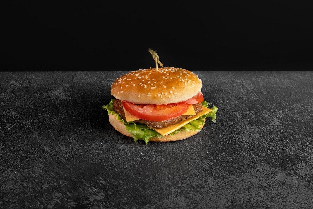 Состав: Нежная булочка, мясная котлета, хрустящий салат, томаты, соус биг тейсти, сыр.