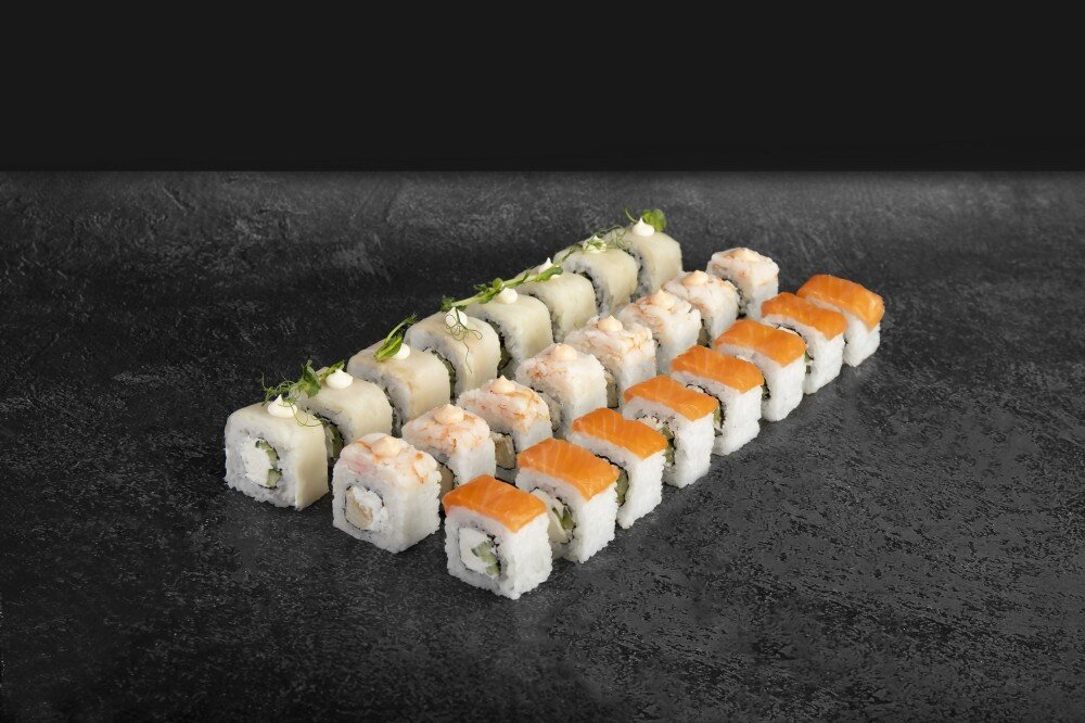 Состав: Спутник, Филадельфия, Пикантная креветка. В комплекте: имбирь-2 шт, васаби-2 шт, соевый соус-2 шт.