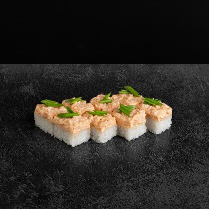 Состав: рис, нори, крабовый мусс, орурец, сыр творожный, икра масаго. В комплекте: имбирь-1 шт, васаби-1 шт, соевый соус-1 шт.
