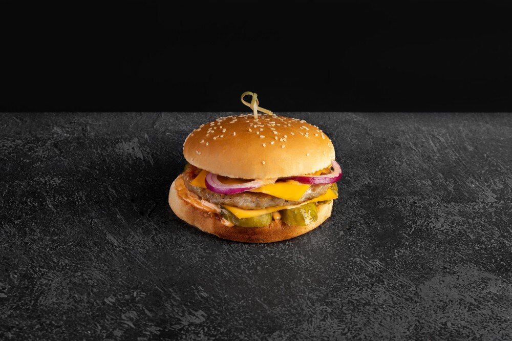 Состав: Нежная булочка, куриная котлета, соус биг тейсти, огурцы соленые, сыр, лук красный.