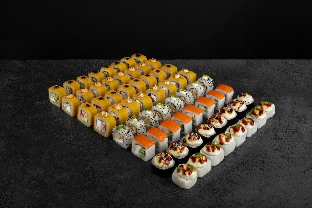 Состав: Темпурный ролл Бакс, Темпурный ролл Кастер, Темпурный ролл Дана, Темпурный ролл Локи, Запеченный ролл Лилу, Филадельфия с огурцом, Запеченный ролл Пикник, Оригинальный ролл Эймон