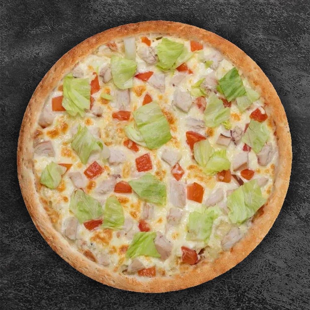 Состав: Тесто, соус цезарь, сыр моцарелла, курица х/к, помидор, сыр пармезан, салат айсберг.