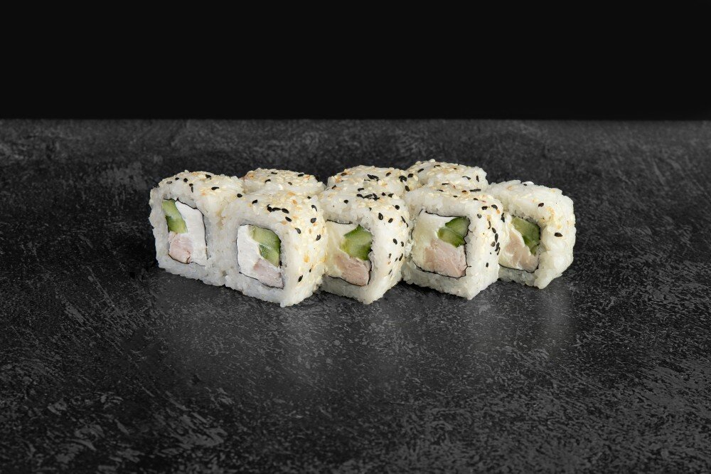 Состав: рис, нори, сыр творожный, огурец, курица х/к, кунжут. В комплекте: имбирь-1 шт, васаби-1шт, соевый соус-1 шт.