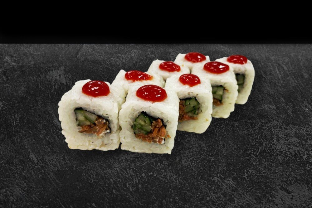 Состав: Рис, нори, лосось жареный в соусе терияки, огурец, соус шрирача. В комплекте: имбирь - 1 шт., васаби - 1 шт., соевый соус - 1 шт.