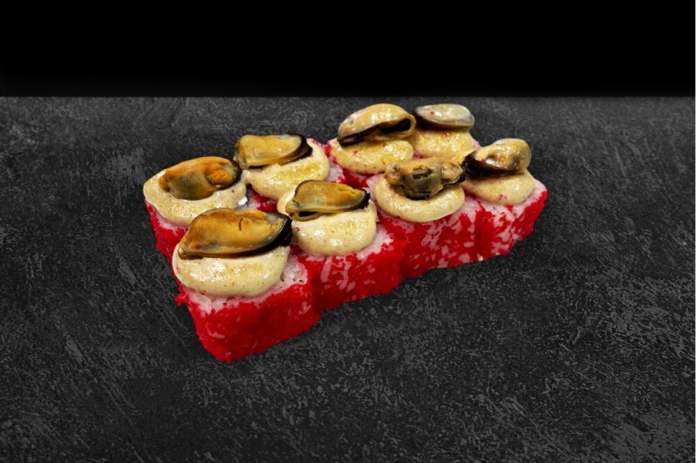 Состав: Рис,нори, сыр творожный, огурец, томаго, икра масаго, соус яки, мидии. В комплекте: имбирь - 1 шт., васаби - 1 шт., соевый соус - 1 шт.