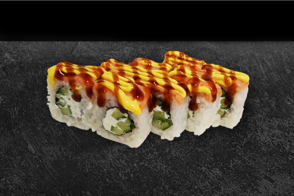 Состав: рис, нори, сыр творожный, огурец, лосось, соус унаги, соус манго. В комплекте: имбирь - 1 шт., васаби - 1 шт., соевый соус - 1 шт.
